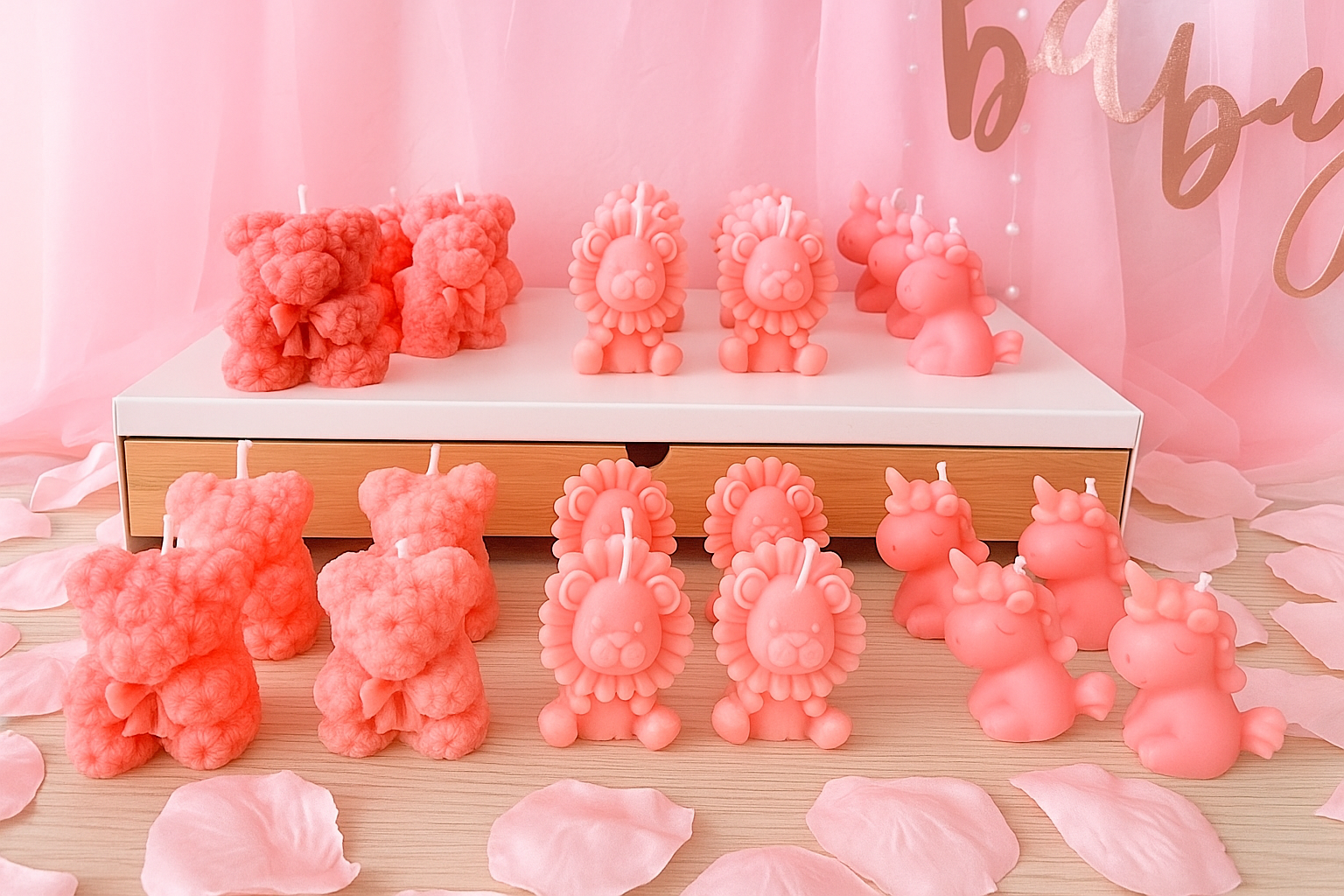 Con formas encantadoras como ositos, unicornios, flores, leones y más, estas velas son el complemento perfecto para decorar con estilo o sorprender con un detalle único.